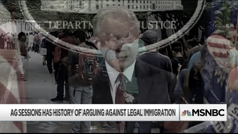 Nothing new under the Sun… Delayed capture of The Attoney General of The United States of America, subliminally expressing his love of racially motivated laws. In the frame, the spectre of Jeff Session; in the backround the Johnson-Reed Act of 1924 protests, as interpreted by protestors in 2017. Foto cortesía de El Show de Rachel Maddow en msnbc.