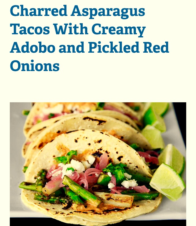 A highly recommended “antojito fusionado” for this upcoming episode of TRMS… Dear, Rachel, the tacos are supposed To “Cool off” any “Fast and Furious Aspersions on Louie’s asparagus,” y pues, mi apreciada Raquel, son unos tacos de espárragos ‘chamuscados’ bañados en crema adobada y cebolla roja curtida (o en vinagre) que si no es lo mismo, pues, es igual)… Bon dégustation!