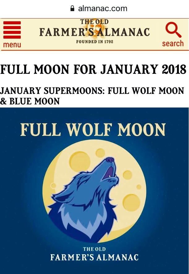 Luna Llena para comenzar el año y Luna Azul para despedir a enero —¡y hasta con Eclipse, Corazón!— para recibir a el mes de febrero; ambas son Super Lunas, fenómeno celestial que sucede cuando un satélite (en este caso: Selene) se arrejunta en el transcurso de su órbita al Cuerpo que orbita (en este escenario: La Tierra). •—_¡_—• Uso justo de todos los almanaques y las Lunas Azules Rojas.