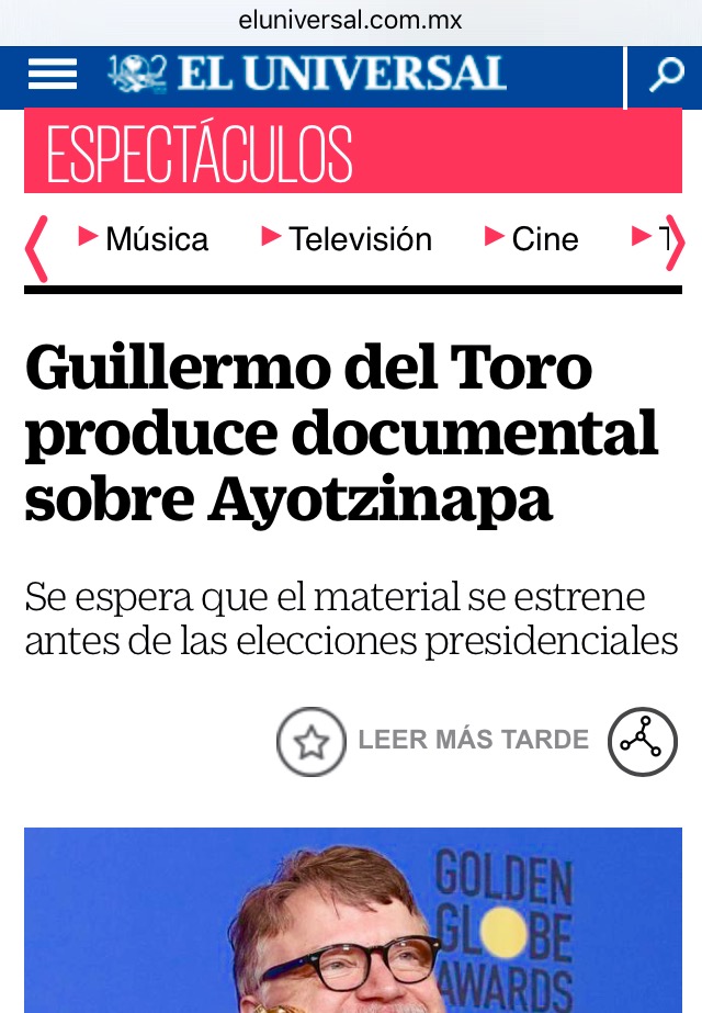 En el transcurso, y del otro lado de la moneda de cada una de esas manifestaciones, el que escribe fue un testigo privilegiado de la respuesta y las reacciones del Gobierno Mexicano y de intereses arrejuntados al pacto y las reformas por México (sin olvidar a las micro empresas del comercio local) mismas que se cooptaron para apagar el auge de las protestas generalizadas del 2011 y 2012 en contra de “la guerra” de Felipe Calderón, y la candidatura de Enrique Peña Nieto a la presidencia; cosa que nosotros [aquí en el staff] argumentamos, que sirvió entre muchas otras cosas y atropellos a la justicia y dignidad de los mexicanos peripatéticos, pues, para ofuscar la cuestión de los asesinatos cometidos por el ejercito mexicano en El Charco, o en Tlatlaya; o los de la policía del Estado de México, allá en San Salvador Atenco, —o valga la covertura— (amigo Gustavo) con el oportuno conflicto exprés que se desataría despues entre los muchachos (buenos y nobles, por supuesto) de Ayotzinapa… y por eso, (Pablo Gleason) ahora únicamente esperemos con ansías ver que va a producir el buen billete de don Guillermo del Toro con ese documental sobre lo que pasó aquella noche de septiembre, en Iguala.