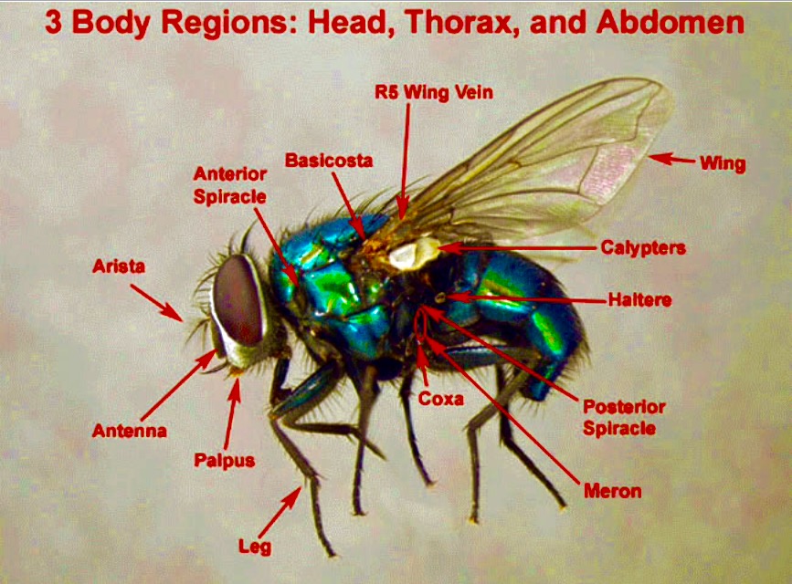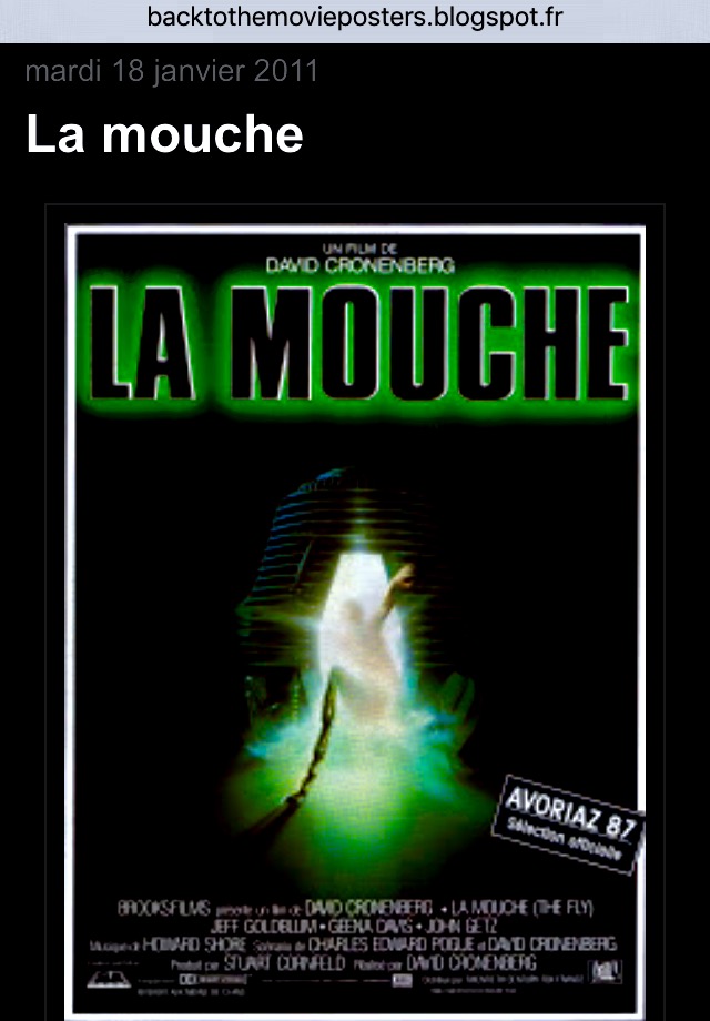 Jeff Goldblum (metamorfoseado) como una Mosca, narra desde una pared y con una bata color azul verde, en seda (tipo Hugh Hefner) con las solapas, cuello, y puños tirándole a un tono asi más o menos como el color del mosaico en la estación del metro de Les Halles (75001) es decir: Chrome Jauni … La Mosca sostiene en una de sus patas una pipa para fumar].