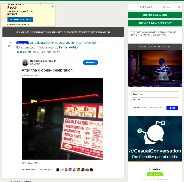 — De cualquier manera, felicidades a don Memo del Toro por su gran logro en la competencia de los Huevos de Oro… Buzzzzz, buzzz— perdón, quise decir Buzzzz, buzzz la competencia de los Huevos Dorados… ¡uta!!! ¿Será por el olor del desayuno en la mesa? — Quise decir: Felicidades, don Memo, por su logro en el show de Los Globos Dorados, y por su inversión en La Tortuga, de paso por Ayotzinapa… o algo así, de cualquier manera, sus colaboradores ya nos informaron de que esa obra será estrenada antes del Día Facto de La Ley Seca Suprema en México es decir, este próximo 1 de julio, 2018.