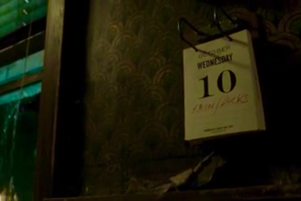 Jeff Goldblum (metamorfoseado) como una Mosca, narra desde una pared y con una bata color azul verde, en seda (tipo Hugh Hefner) con las solapas, cuello, y puños tirándole a un tono asi más o menos como el color del mosaico en la estación del metro de Les Halles (75001) es decir: Chrome Jauni … La Mosca sostiene en una de sus patas una pipa para fumar].