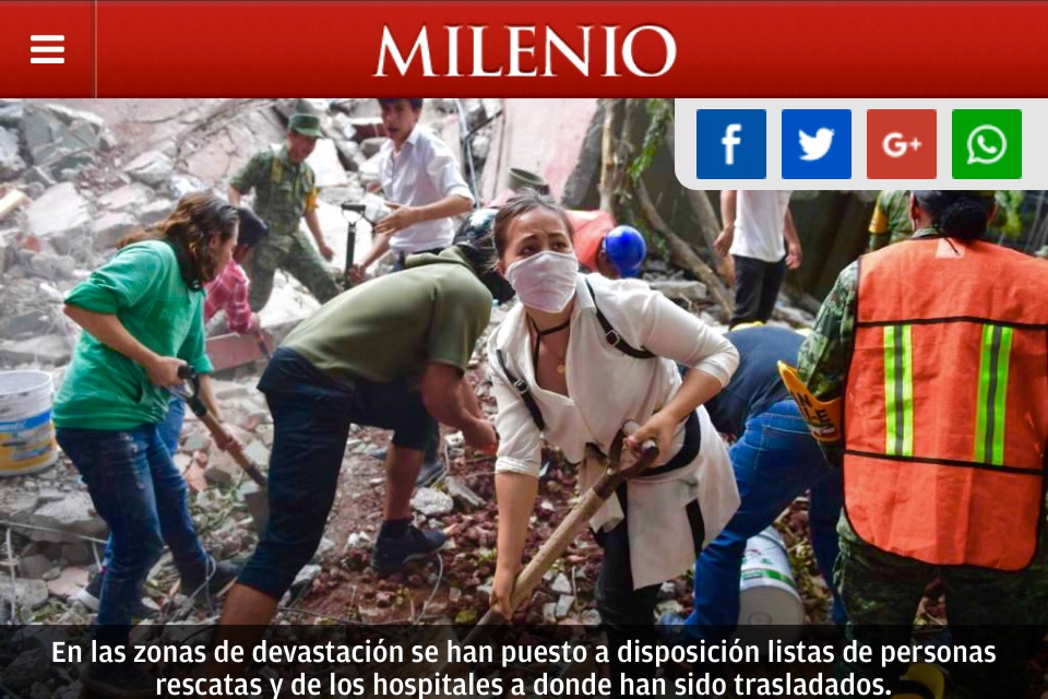 Está fue la imagén que le dío la vuelta al mundo, entre la tragedia —que fue inevitable de mostrar— y el morbo de otras agencias —que de cierta manera evocarón aquellas imagenes de la revista Alarma!— está foto muestra la solidaridad en tiempos dificiles… El credito de la foto no aparece en el cuadro, pero eso, por ahora es lo de menos; mañana le preguntamos a los del “mundo” para a ver de quién es.